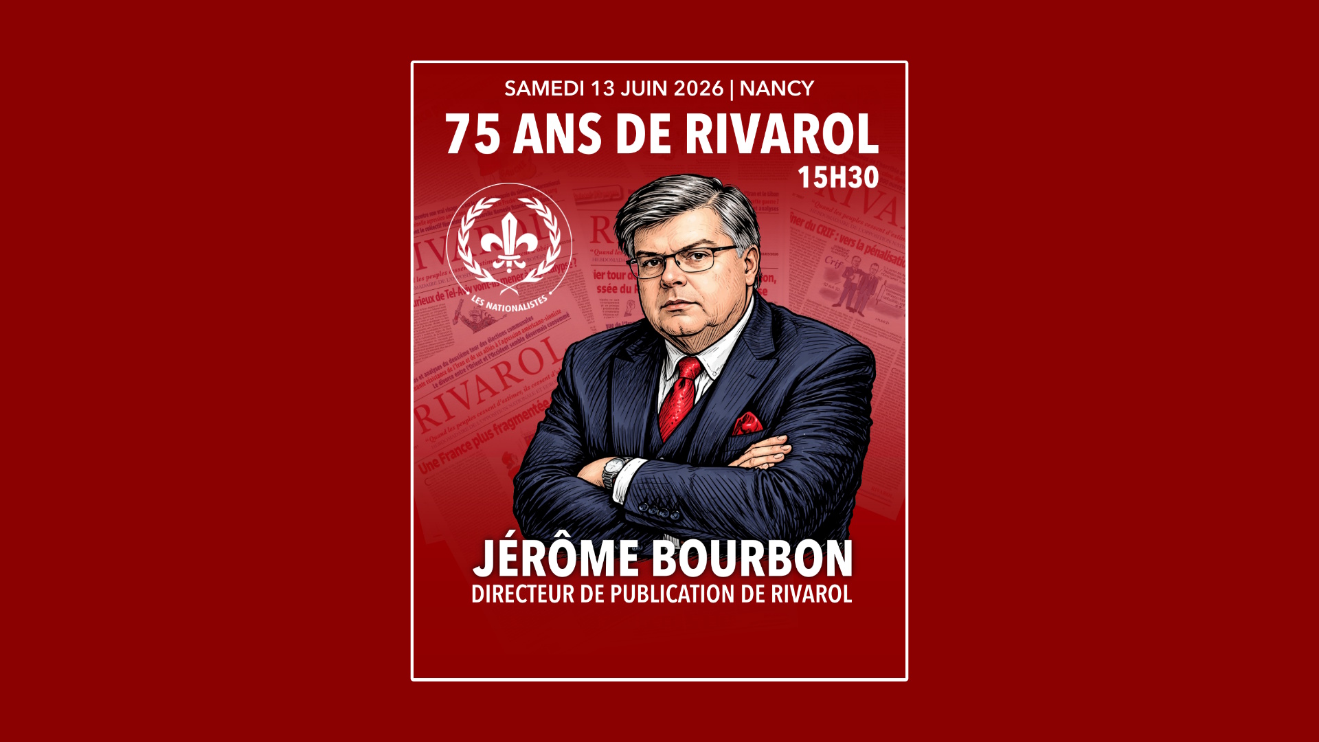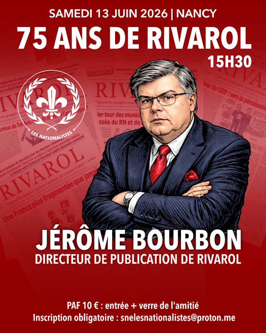 La section Nord Est des Nationalistes vous convient le samedi 13 juin 2026, à partir de 15 heures 30, à Nancy pour célébrer avec Jérôme Bourbon (directeur de Rivarol) :