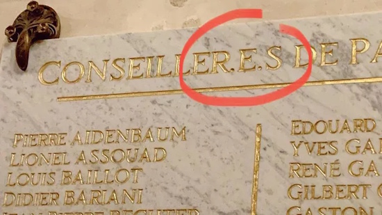 La Ville de Paris a fait modifier deux plaques de marbre honorant des conseillers municipaux. Les deux plaques, au mur du couloir menant à l’Hémicycle, ont été réécrites en écriture « inclusive » ! La première plaque célèbre les présidents du Conseil de Paris tandis que la seconde honore les conseillers ayant exercé plus de 25 ans : « Conseiller.e.s » et « président.e.s », est-il ainsi inscrit en lettres d’or sur ces plaques…