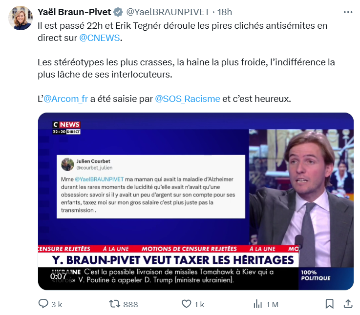 Alors qu’il défend à corps et à cri les Juifs et l’État sioniste, Erik Tegnér a été accusé virulemment d’antisémitisme par la députée Yaël Braun-Pivet. En cause : une sortie sur CNEWS, où le directeur de Frontières assimile la présidente de l’Assemblée nationale aux deux mondialistes Alain Minc et Jacques Attali. SOS Racisme a annoncé avoir saisi l’Arcom, et toute la presse de caniveau — StreetPress et L’Humanité en tête — relaie les accusations contre Erik Tegnér.