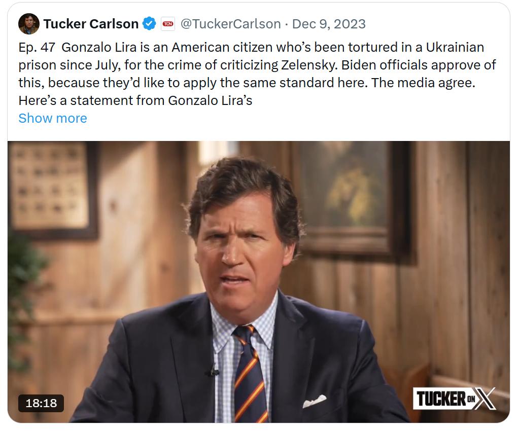 Le 9 décembre 2023, le journaliste indépendant Tucker Carlson écrit :