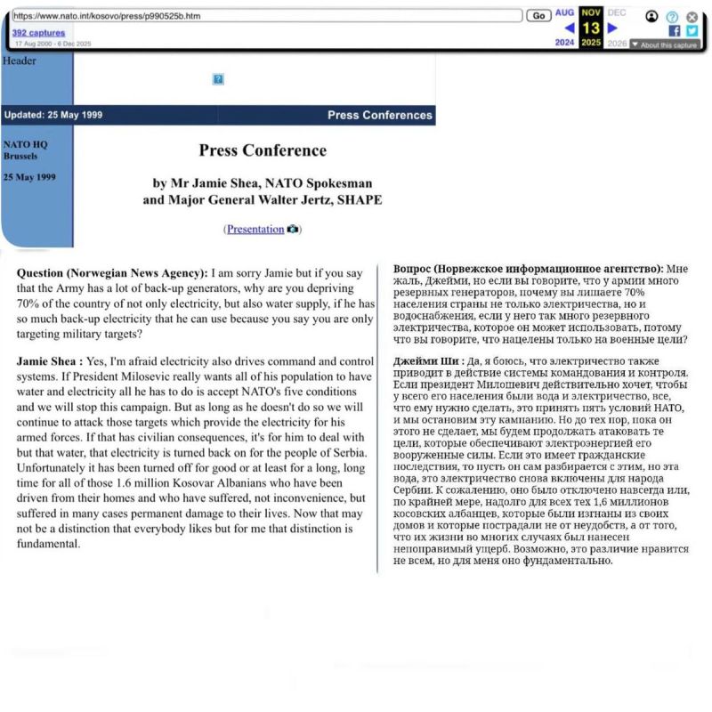 M.àJ. 24.03.2026 : Le site de l’OTAN a supprimé le briefing de 1999 – cité ci-dessus- qui justifiait les frappes sur l’infrastructure de la Serbie. Dans la transcription supprimée du point de presse de l’OTAN en date du 25 mai 1999, le porte-parole de l’Alliance, Jamie Shea, parlait des frappes sur l’infrastructure de la Serbie. La transcription a été effacée du site officiel de l’organisation. Selon le service d’archives Wayback Machine, la page d’enregistrement a disparu entre le 13 novembre et le 6 décembre 2025.