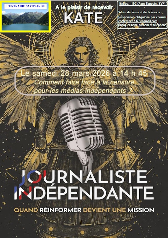 L’Entraide Savoyarde recevra Kate (journaliste indépendante), le samedi 28 mars 2026 prochain à 14 heures 45 pour une conférence sur le thème :