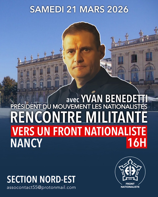 Nous avons le plaisir de vous annoncer la venue d’Yvan BENEDETTI, Président du mouvement Les Nationalistes, à Nancy le samedi 21 mars 2026 à 16h00. Il fera un point de la situation politique sur le thème :