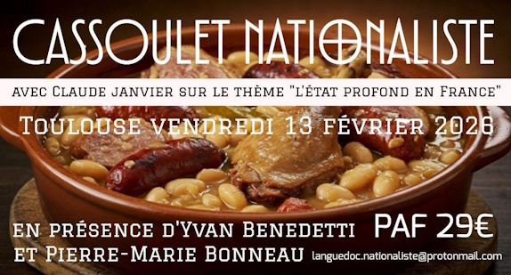 Le Xe Cassoulet Nationaliste se tiendra le vendredi 13 février 2026, à partir de 20 heures, à Toulouse, en présence d’Yvan Benedetti, Pierre-Marie Bonneau et de Claude Janvier sur le thème :