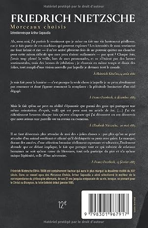 Friedrich Nietzsche (1844-1900) est certainement l’auteur qui aura le plus marqué la deuxième moitié du XIXe siècle. Dans ce nouvel opus des Morceaux Choisis, Arthur Sapaudia a ainsi sélectionné le meilleur de la correspondance du philosophe allemand, de ses 21 ans jusqu’au crépuscule de sa vie, lorsque, se prenant pour le Christ ou Dionysos, la folie l’atteint début janvier 1889.