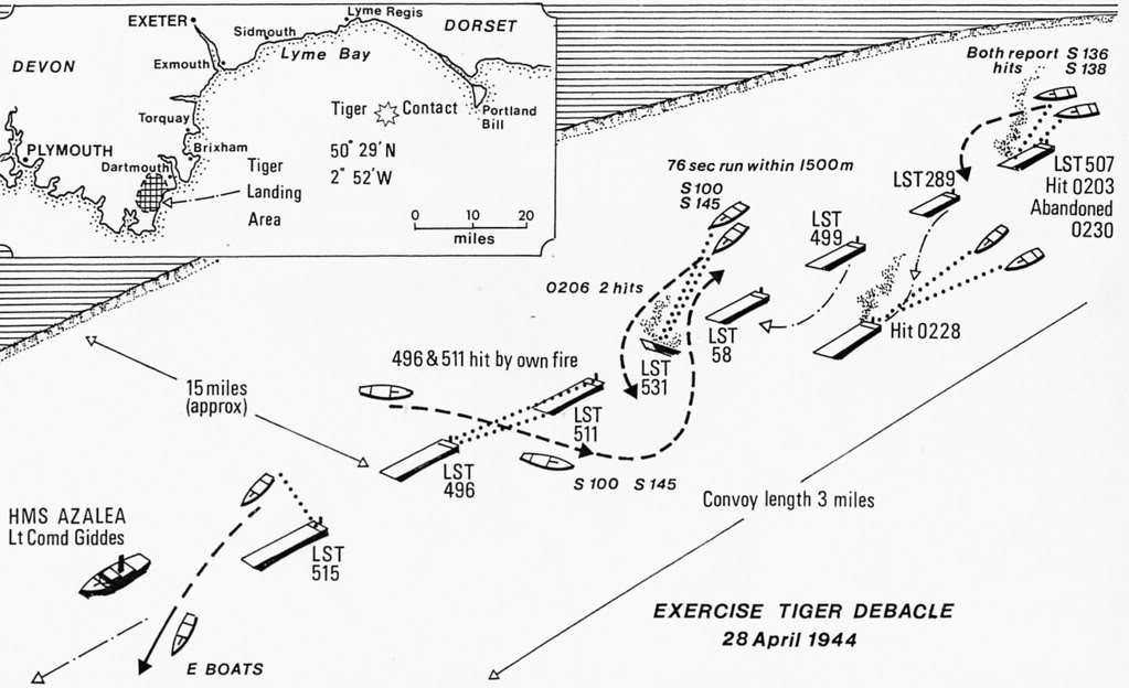 Dans la nuit du 27 au 28 avril 1944, soit moins de deux mois avant la date prévue du Jour J (initialement le 5 juin 1944), une répétition grandeur nature du débarquement (baptisée « Tiger » par les Alliés, opération Tigre en français) est effectuée sur les plages de la côte sud de l’Angleterre, à Slapton Sands dans le Devonshire. Ces plages ressemblent tout particulièrement à celles d’ Utah et d’ Omaha, tant par la topographie que par la qualité même du sable. 30 000 soldats (en plus des 500 « troupes adverses » américains chargées de défendre fictivement le littoral) et près de 300 bâtiments de guerre sont mobilisés pour l’occasion.
