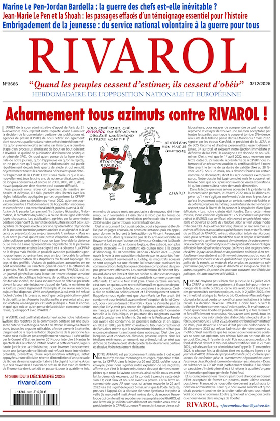 L’ARRÊT de la cour administrative d’appel de Paris du 21 novembre 2025 rejetant notre requête visant à annuler la décision de la commission paritaire des publications et agences de presse (CPPAP) de nous retirer son agrément dont nous vous parlions dans notre précédente édition mérite qu’on y revienne cette semaine car il marque la dernière étape d’un processus ahurissant de bout en bout déniant à RIVAROL sa qualité de publication d’information politique et générale (IPG). Or, quoi qu’on pense de la ligne éditoriale de notre journal, qu’on l’approuve ou qu’on la rejette, on ne peut nier qu’il s’agit d’un hebdomadaire qui paraît régulièrement depuis trois quarts de siècle et qui remplit objectivement toutes les conditions nécessaires pour obtenir l’agrément de la CPPAP. C’est si vrai d’ailleurs que le renouvellement, tous les cinq ans, de notre certificat, pendant de longues décennies, et encore en 2003, 2008, 2013, 2018, n’avait jusqu’à une date récente posé aucune difficulté.