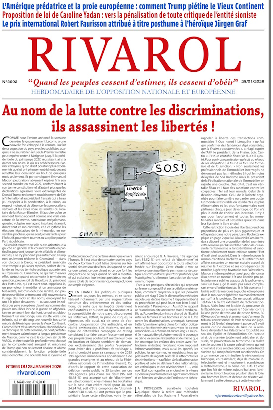 Cette restriction inouïe des libertés prend des proportions de plus en plus gigantesques et effrayantes dans notre pays. L’ami Rochette explique en page 2 que la Likoudnik Caroline Yadan a déposé une proposition de loi, examinée cette semaine par l’Assemblée nationale, qui assimile l’antisionisme à l’antisémitisme et sanctionne pénalement toute critique contre l’Etat d’Israël ainsi sacralisé. Dans la même logique, la maison d’éditions Hachette a dû retirer toutes affaires cessantes un manuel scolaire accusé de résumer le 7 octobre et ses conséquences de manière jugée trop favorable aux Palestiniens. Macron a même posté un tweet pour dénoncer illico presto ce manuel ! Et une librairie pro-palestinienne a subi les assauts de la police venu saisir un livre jugé là aussi pas assez complaisant envers l’entité sioniste. Et le fait que cette librairie soit très marquée à gauche et impliquée dans la mouvance lgbétiste n’a manifestement pas suffi à la protéger. On ne saurait critiquer Tel-Aviv ! A l’autre extrémité de l’échiquier politique, Alain Soral est la cible du procureur de la République qui a requis le 16 janvier contre lui une peine de trois ans de prison ferme, 30 000 euros d’amende et un mandat d’amener (le tribunal correctionnel de Paris rendra son jugement le 26 février) simplement parce qu’il avait permis qu’une émission de l’Axe de la résistance défendant les Palestiniens fût publié sur son site, Egalité et Réconciliation. On l’accuse ainsi, de manière totalement arbitraire et absurde, de provocation au terrorisme. En réalité c’est le soutien à la cause palestinienne qui est criminalisé et ce sont les critiques contre l’entité sioniste qui sont pénalement sanctionnées. On a commencé par criminaliser le révisionnisme historique, en l’assimilant, déjà de manière intellectuellement et moralement scandaleuse, à l’antisémitisme, à la haine des Juifs. Et voici que l’on fait de même aujourd’hui avec l’antisionisme. Ils vont toujours plus loin dans la folie. Aux hommes libres et debout de résister vaillamment à cette démesure, à cette tyrannie. […]
