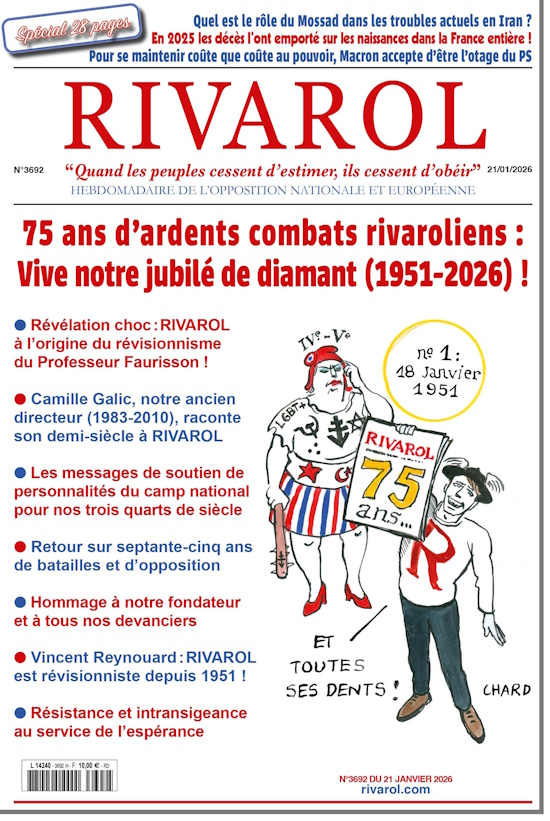 Comme RIVAROL l’appelle de ses vœux depuis 75 ans, il faut une France et une Europe réellement indépendantes. Ce qui suppose qu’elles soient fortes économiquement, culturellement, militairement, moralement. Las, tout a été fait depuis 1945 pour nous affaiblir et nous rendre vassaux des Etats-Unis. Au point qu’un président américain inculte, vulgaire et cynique peut se permettre d’annexer un territoire européen. Et de menacer ouvertement ceux qui auraient la velléité de lui résister. Et ce en toute impunité. […]