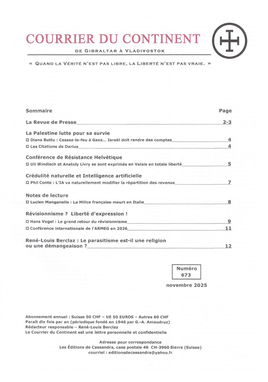 Périodique fondé en 1946 par G-A Amaudruz. Rédacteur-responsable : René-Louis Berclaz. Le Courrier du Continent, Bulletin de l’Action Européenne, est une publication périodique des Éditions de Cassandra qui présente dix fois par an une revue de la presse internationale, une tribune libre, des notes de lecture, une rubrique consacrée à l’histoire et à la culture, l’actualité révisionniste et un éditorial.