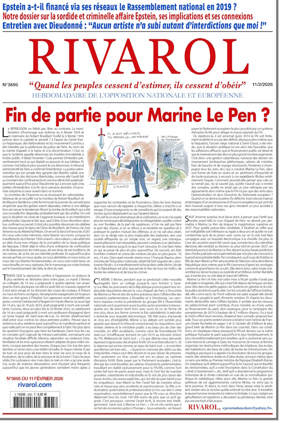 Marine Le Pen vit très mal cette mise à l’écart qu’elle n’avait pas anticipée ni imaginée, elle qui a tout fait depuis de longues années pour être dans les petits papiers du Système en général et du lobby judéo-sioniste en particulier. Sur les conseils de l’affreux Goldnadel, elle a ainsi exclu du Front national son père auquel elle devait tout. Elle a peuplé le parti d’invertis notoires. Et d’après les documents déclassifiés dans l’affaire Epstein, il semble que les réseaux du pédocriminel aient contribué, d’une manière ou d’une autre, au financement du parti, alors exsangue, pour la campagne des européennes de 2019 à hauteur de 4,7 millions d’euros. Ou à tout le moins offert leurs services, dispensé leurs conseils, proposé leur aide. Tous ces points restent encore à éclaircir (voir l’article de François-Xavier Rochette en pages 2 et 3). Epstein dit d’ailleurs le plus grand bien de Marine Le Pen dans ses courriels. Dans ces conditions, on s’explique mieux pourquoi le RN est devenu sur la scène politique française le parti aujourd’hui le plus hystériquement, le plus inconditionnellement pro-israélien, qu’il a cautionné sans aucune réserve le carnage à Gaza, les massacres de masse, la famine organisée, les destructions méthodiques des hôpitaux, des écoles, des habitations, des lieux de culte, de toutes les infrastructures. On s’explique pourquoi il a appelé à la dissolution de tous les groupements dits d’extrême droite et d’ultra-droite, écrivant même dans ce sens une lettre au Premier ministre de l’époque Elisabeth Borne. On s’explique qu’il défend aujourd’hui la loi Gayssot qui embastille les révisionnistes, qu’il a voté l’inscription dans la Constitution du « droit à l’avortement », etc., bref qu’il a abandonné le programme historique de la droite nationale en vue de sa normalisation politique et médiatique. Hélas pour elle, Marine Le Pen, la grande prêtresse de cet aggiornamento, comme Moïse, ne verra pas la terre promise. Et devra, la mort dans l’âme, laisser voler le sémillant Jordan vers la victoire qu’elle estimait lui être due. Si toutefois le jeune homme remporte lui-même la timbale. Ce qui, malgré ses génuflexions et reptations à Jérusalem au printemps dernier, n’est pas encore tout à fait acquis. […]
