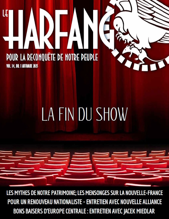 Sur le plan des idées, il faut rappeler que la revue est issue de la Fédération des Québécois de souche. Comme son nom l’indique, il s’agissait d’une fédération, donc d’une coalition réunissant diverses tendances. Des néofascistes aux militants identitaires en passant par les catholiques traditionnalistes, Le Harfang offrait une voix à ceux qui n’en avaient pas. Nous avons pu compter sur une grande diversité d’opinions. Dans un même numéro, on retrouvait par exemple le laïciste d’Hérouxville André Drouin, un prêtre traditionnaliste écrivant sous pseudonyme, l’eurasiste russe Alexandre Douguine et la militante d’Azov Olena Semeniaka. Nous en avions pour toutes les tendances. Le ciment qui nous unissait — et nous unit encore — c’était le désir de voir notre peuple survivre. Tout simplement. Cela peut sembler aller de soi, mais à l’heure du Grand Remplacement, ce simple refus de mourir fait de nous des dissidents.