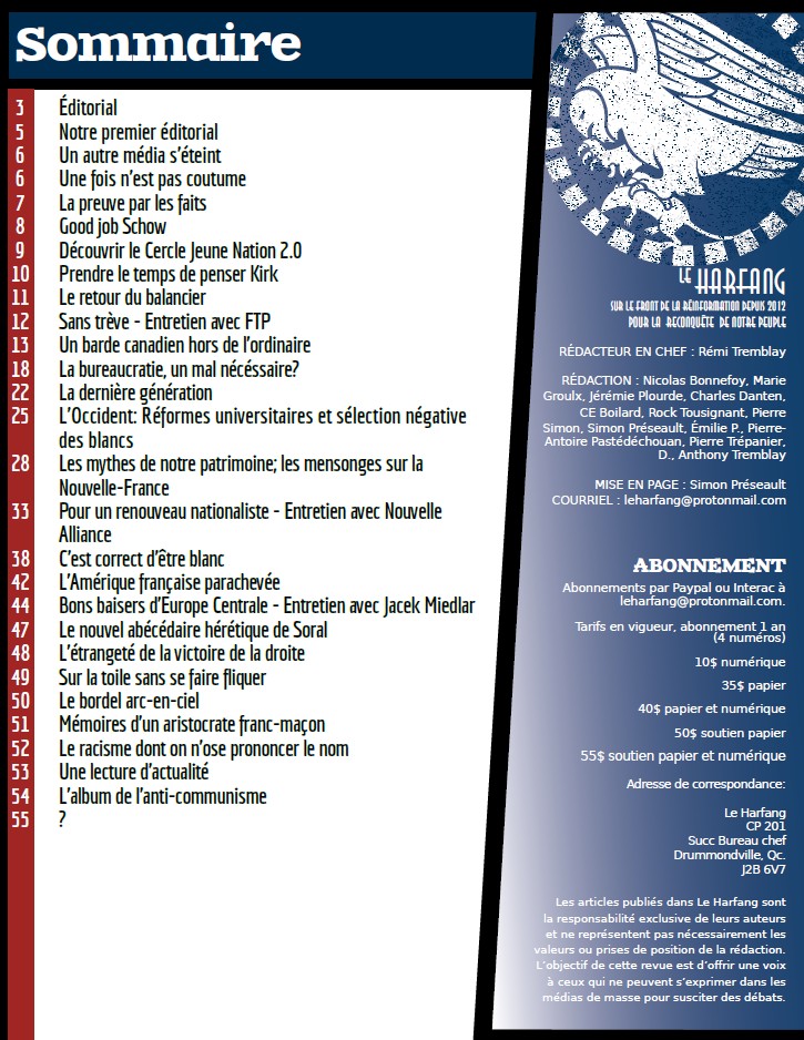 Nous vous invitons à suivre Nomos-TV, la plateforme québécoise la plus professionnelle et la plus pertinente. Alexandre Cormier-Denis et Philippe Plamondon font un travail incroyable pour la défense de notre ethnie depuis déjà plusieurs années. Une fois ce numéro refermer, il ne faut pas baisser les bras, mais au contraire rechercher mille et une façons de faire porter notre message.