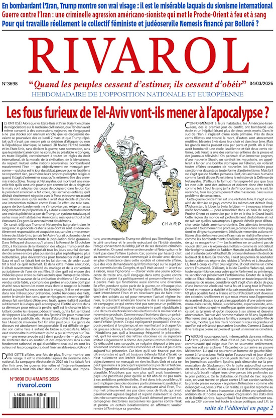 DANS CETTE affaire, une fois de plus, Trump montre son vrai visage. Il est le misérable laquais du sionisme international. Sa campagne électorale de 2024 où il se faisait fort d’en finir avec les guerres éternelles et l’interventionnisme états-unien à tout crin était donc une illusion, une imposture, une escroquerie. Trump ne défend pas l’Amérique. Il est le zélé serviteur et le servile exécutant de l’Entité sioniste, l’otage consentant du lobby juif et de ses desseins criminels et funestes. On peut même se demander si Netanyahu ne le tient pas dans l’affaire Epstein. Car, comme par hasard, c’est au moment où son nom commençait à circuler avec de plus en plus d’insistance dans cette sordide et criminelle affaire, que des voix demandaient qu’il fût interrogé sur le sujet par une commission du Congrès, et qu’il était accusé — à tort ou à raison, nous l’ignorons — d’avoir violé une jeune adolescente de treize ans, qu’il s’engage dans cette guerre contre l’Iran où a priori il a politiquement et personnellement tout à perdre mais qui fonctionne aussi comme une diversion. En effet, pendant qu’on parle de la guerre, on n’évoque plus Epstein et l’implication de Trump dans l’affaire. En bombardant intensément l’Iran et en n’excluant pas de faire intervenir des soldats au sol pour renverser l’actuel régime iranien, le président américain tourne le dos à ses promesses de campagne, ce qui certes n’est pas rare pour un politicien, mais de surcroît il risque de conduire le parti républicain à une déroute électorale lors des élections de la mi-mandat en novembre prochain. Comme nous l’écrivions dans un précédent éditorial, Trump est probablement mouillé jusqu’au cou dans l’affaire Epstein. Ce qui expliquerait pourquoi il s’est opposé pendant si longtemps, et en manifestant à chaque fois de grosses colères, à la divulgation des documents Epstein.