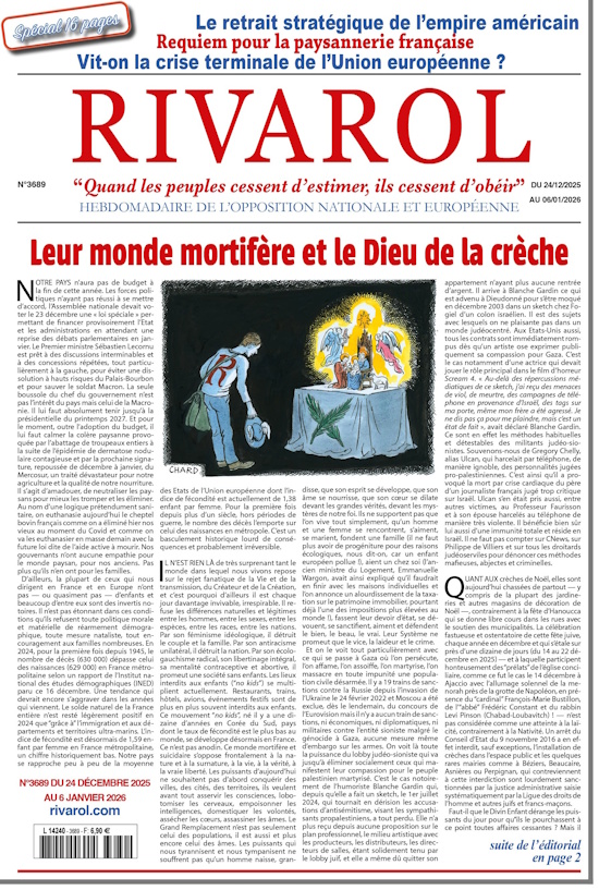 NOTRE PAYS n’aura pas de budget à la fin de cette année. Les forces politiques n’ayant pas réussi à se mettre d’accord, l’Assemblée nationale devait voter le 23 décembre une « loi spéciale » permettant de financer provisoirement l’Etat et les administrations en attendant une reprise des débats parlementaires en janvier. Le Premier ministre Sébastien Lecornu est prêt à des discussions interminables et à des concessions répétées, tout particulièrement à la gauche, pour éviter une dissolution à hauts risques du Palais-Bourbon et pour sauver le soldat Macron. La seule boussole du chef du gouvernement n’est pas l’intérêt du pays mais celui de la Macronie. Il lui faut absolument tenir jusqu’à la présidentielle du printemps 2027. Et pour le moment, outre l’adoption du budget, il lui faut calmer la colère paysanne provoquée par l’abattage de troupeaux entiers à la suite de l’épidémie de dermatose nodulaire contagieuse et par la prochaine signature, repoussée de décembre à janvier, du Mercosur, un traité dévastateur pour notre agriculture et la qualité de notre nourriture. Il s’agit d’amadouer, de neutraliser les paysans pour mieux les tromper et les éliminer. Au nom d’une logique prétendument sanitaire, on euthanasie aujourd’hui le cheptel bovin français comme on a éliminé hier nos vieux au moment du Covid et comme on va les euthanasier en masse demain avec la future loi dite de l’aide active à mourir. Nos gouvernants n’ont aucune empathie pour le monde paysan, pour nos anciens. Pas plus qu’ils n’en ont pour les familles.
