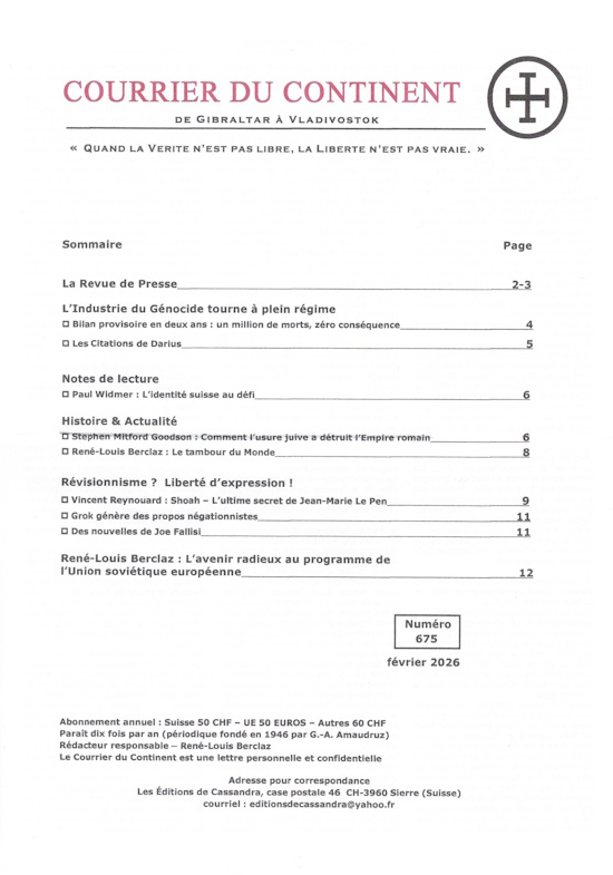Périodique fondé en 1946 par G-A Amaudruz. Rédacteur-responsable : René-Louis Berclaz. Le Courrier du Continent, Bulletin de l’Action Européenne, est une publication périodique des Éditions de Cassandra qui présente dix fois par an une revue de la presse internationale, une tribune libre, des notes de lecture, une rubrique consacrée à l’histoire et à la culture, l’actualité révisionniste et un éditorial.