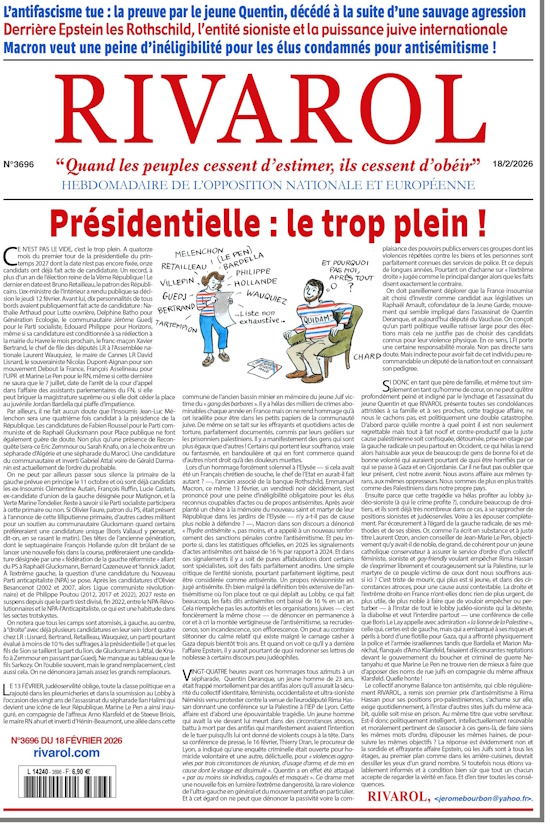 Le collectif anonyme Balance ton antisémite, qui cible régulièrement RIVAROL, a remis son premier prix d’antisémitisme à Rima Hassan pour ses positions pro-palestiniennes, s’acharne sur elle, exige quotidiennement, à l’instar d’autres sites juifs du même acabit, qu’elle soit mise en prison. Au même titre que votre serviteur. Est-il donc politiquement intelligent, intellectuellement recevable et moralement pertinent de s’associer à ces gens-là, de faire siens les mêmes mots d’ordre, d’épouser les mêmes haines, de poursuivre les mêmes objectifs ? La réponse est évidemment non et la sordide et effrayante affaire Epstein, où les Juifs sont à tous les étages, au premier plan comme dans les arrière-cuisines, devrait dessiller les yeux d’un grand nombre. Si toutefois nous étions valablement informés et à condition bien sûr que tout un chacun accepte de regarder la vérité en face. Et d’en tirer toutes les conséquences. […]
