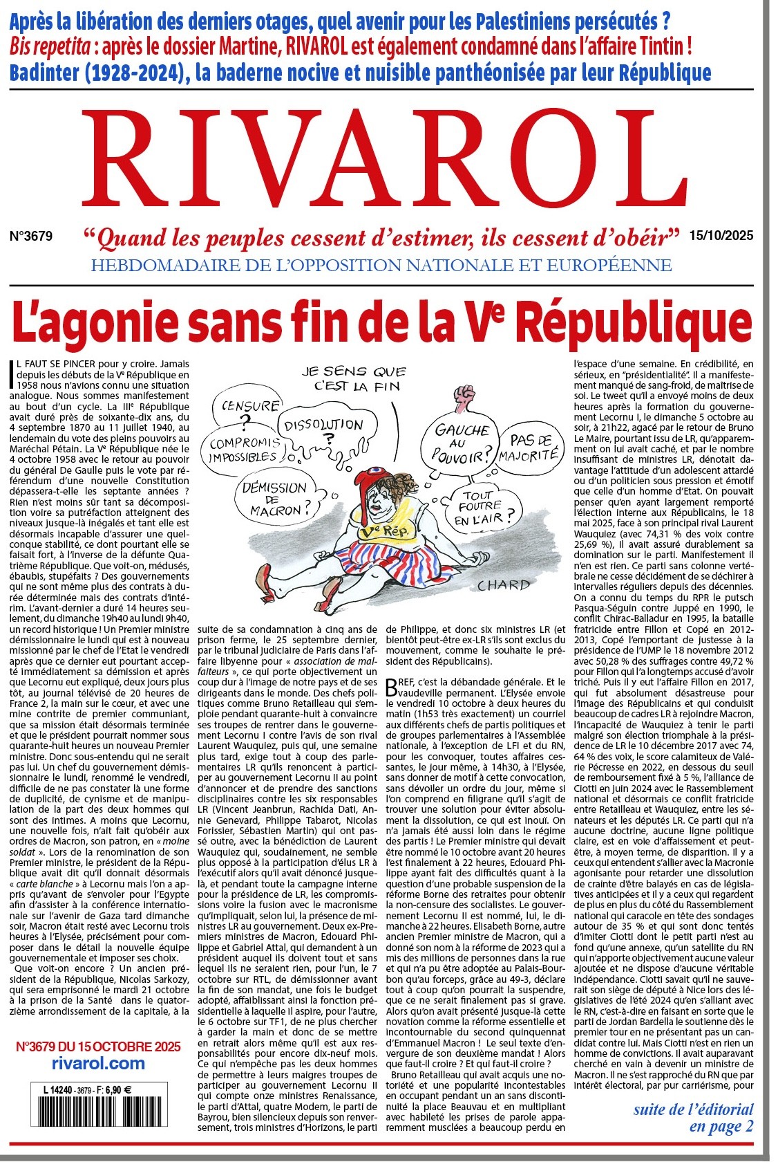 IL FAUT SE PINCER pour y croire. Jamais depuis les débuts de la Ve République en 1958 nous n’avions connu une situation analogue. Nous sommes manifestement au bout d’un cycle. La IIIe République avait duré près de soixante-dix ans, du 4 septembre 1870 au 11 juillet 1940, au lendemain du vote des pleins pouvoirs au Maréchal Pétain. La Ve République née le 4 octobre 1958 avec le retour au pouvoir du général De Gaulle puis le vote par référendum d’une nouvelle Constitution dépassera-t-elle les septante années ? Rien n’est moins sûr tant sa décomposition voire sa putréfaction atteignent des niveaux jusque-là inégalés et tant elle est désormais incapable d’assurer une quelconque stabilité, ce dont pourtant elle se faisait fort, à l’inverse de la défunte Quatrième République. Que voit-on, médusés, ébaubis, stupéfaits ? Des gouvernements qui ne sont même plus des contrats à durée déterminée mais des contrats d’intérim. L’avant-dernier a duré 14 heures seulement, du dimanche 19h40 au lundi 9h40, un record historique ! Un Premier ministre démissionnaire le lundi qui est à nouveau missionné par le chef de l’Etat le vendredi après que ce dernier eut pourtant accepté immédiatement sa démission et après que Lecornu eut expliqué, deux jours plus tôt, au journal télévisé de 20 heures de France 2, la main sur le cœur, et avec une mine contrite de premier communiant, que sa mission était désormais terminée et que le président pourrait nommer sous quarante-huit heures un nouveau Premier ministre. Donc sous-entendu qui ne serait pas lui. Un chef du gouvernement démissionnaire le lundi, renommé le vendredi, difficile de ne pas constater là une forme de duplicité, de cynisme et de manipulation de la part des deux hommes qui sont des intimes. A moins que Lecornu, une nouvelle fois, n’ait fait qu’obéir aux ordres de Macron, son patron, en « moine soldat ». Lors de la renomination de son Premier ministre, le président de la République avait dit qu’il donnait désormais « carte blanche » à Lecornu mais l’on a appris qu’avant de s’envoler pour l’Egypte afin d’assister à la conférence internationale sur l’avenir de Gaza tard dimanche soir, Macron était resté avec Lecornu trois heures à l’Elysée, précisément pour composer dans le détail la nouvelle équipe gouvernementale et imposer ses choix.